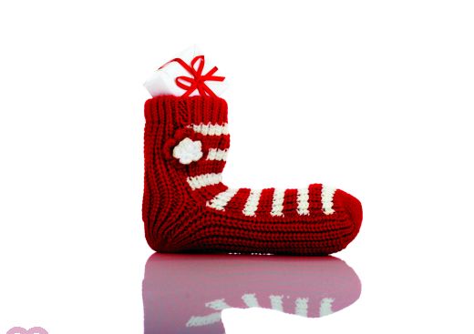 Gestrickter oder gehäkelter Weihnachtsschuh mit kleinen Geschenken.