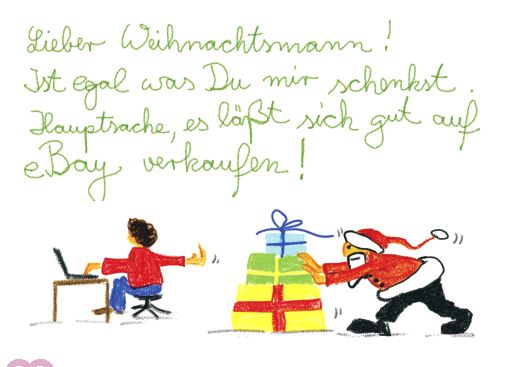 Kinderzeichnung für den Weihnachtsmann mit dem Text in Schreibschrift: "Lieber Weihnachtsmann! Ist egal was Du mir schenkst. Hauptsache, es läßt sich gut auf eBay verkaufen!"