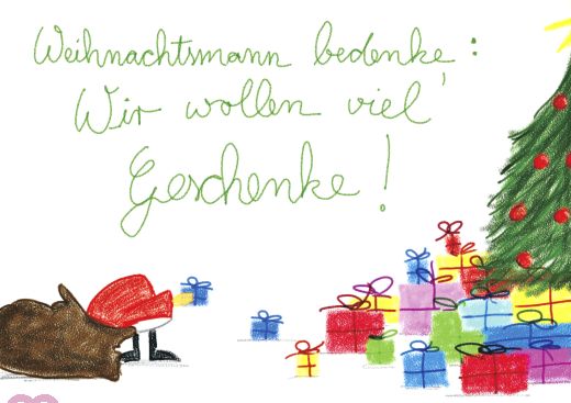 Kinderzeichnung für den Weihnachtsmann mit dem Text in Schreibschrift: "Weihnachtsmann bedenke: Wir wollen viel' Geschenke!"