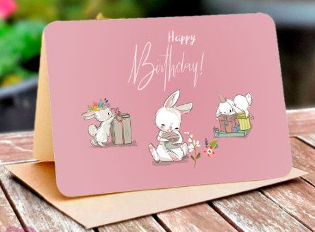 Bunnies with gifts are preparing for the birthday party with the saying "Happy Birthday".