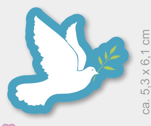 Peace dove with mistletoe as a wooden magnet. Measures about 5.3 cm x 6.1 cm.