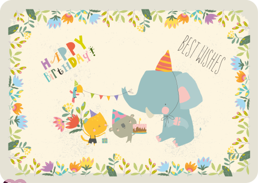 A cat, a parrot, a koala bear and an elephant celebrate a birthday - natural paper postcard with rounded corners landscape format DIN A6printed on high quality recycled uncoted paper