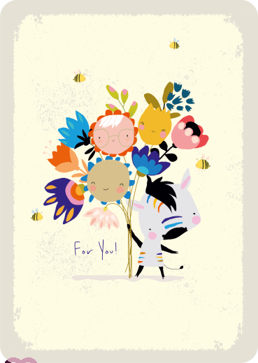 Zebra with large bouquet of flowers - natural paper postcard rounded corners portrait format DIN A6printed on high quality recycled uncoted paper
