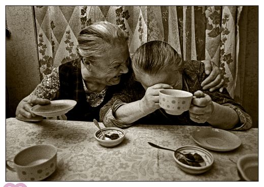 "The grandmas talks about the grandpas", women, old, older women, friendship, laugh, tell, conversation, talk, gossip, socializing, table, home, drinking coffee, eating cake, landscape, b/w
