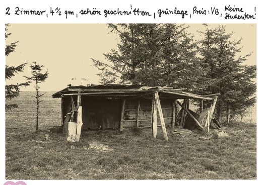 wooden hut, landscape, field, sayings, slogan, " 2 rooms, 4 1/2 sqm, nice cut, green area, price: VB, no students !, moving cards, new address, change of address, move, b/w, landscape
