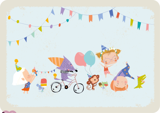 Fox on a bicycle, three children, a mouse and a frog with ice cream, a monkey with balloons, two chicks and a small crocodile with birthday cake celebrate their birthday together - natural paper postcard with rounded corners landscape format DIN A6printed on high quality recycled uncoted paper