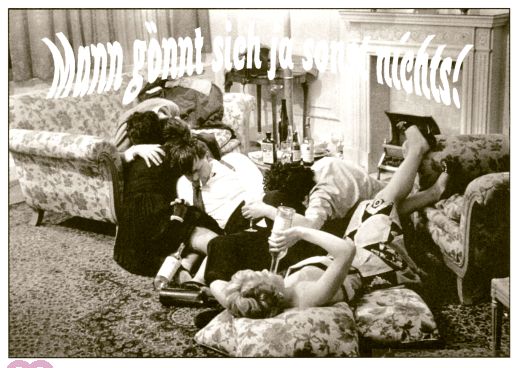 Drunk men at a party saying " Man, men don't treat themselves to anything else ! "