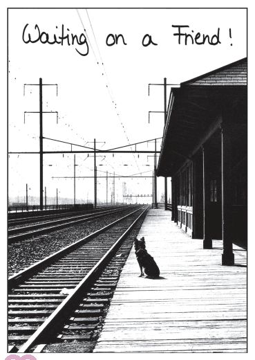 A dog waiting for the train at the station with his masters and the saying " Waiting on a Friend ! "