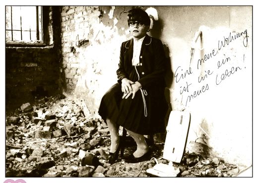 Woman, women, vacuum cleaner, demolition house, sayings, slogan " A new apartment is like a new life ! " , moving cards, new address, change of address, moving, b/w, landscape