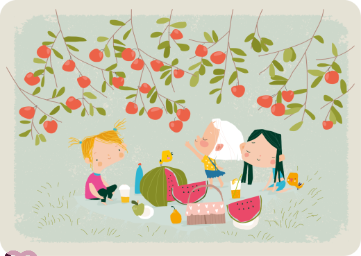 Picnic with friends - three girls with melon, fruit and drinks sitting on a blanket under an apple tree - natural paper postcard rounded corners landscape format DIN A6printed on high quality recycled uncoted paper