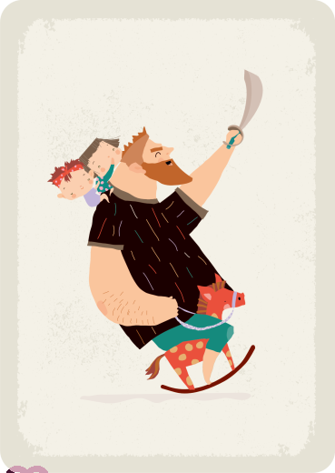 Father rocking with two children on his shoulder on a rocking horse - natural paper postcard rounded corners portrait format DIN A6printed on high quality recycled uncoted paper
