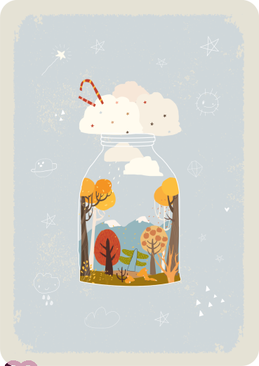 Biosphere with trees, mountains, clouds and foxes in a jar - natural paper postcard rounded corners portrait format DIN A6printed on high quality recycled uncoted paper