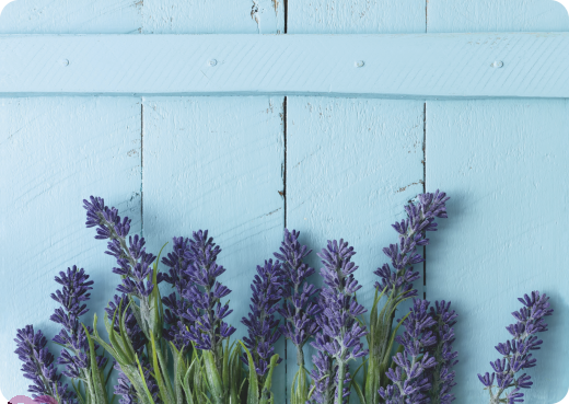 Fresh lavender in front of a light blue painted board wall.
