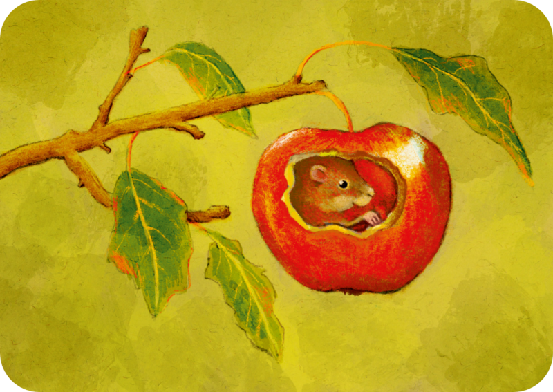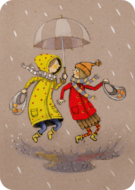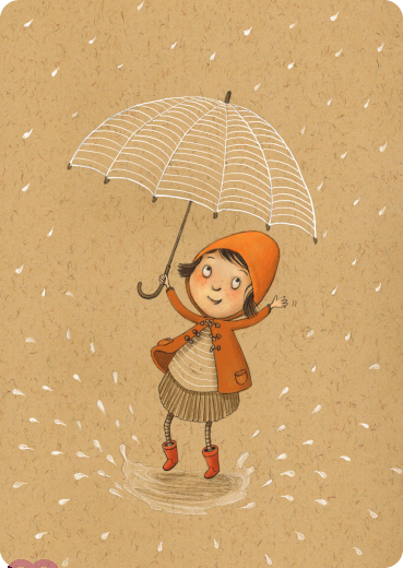 Girl with red raincoat and red rubber boots dances with umbrella in the rain. Illustration by Imke Sönnichsen.