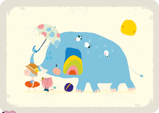 Blue elephant with parasol, a girl with swimming tyre and cat on the way to the beach - natural paper postcard rounded corners landscape format DIN A6printed on high quality recycled uncoted paper